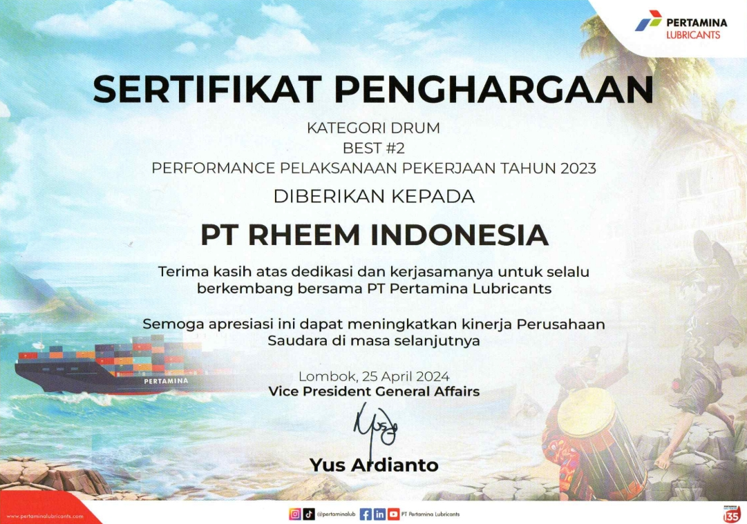Certification Home Certification Certification of ISO 9001 : 2015 Certification of UN Marking Certification of HALAL ASSURANCE Certification of HALAL ASSURANCE Certificate of Merit from PERTAMINA LUBRICANTS Award Trophy from PERTAMINA LUBRICANTS BEST PROCUREMENT PERFORMANCE VENDOR Category Drum 20 Maret 2023 Certificate from PERTAMINA LUBRICANTS